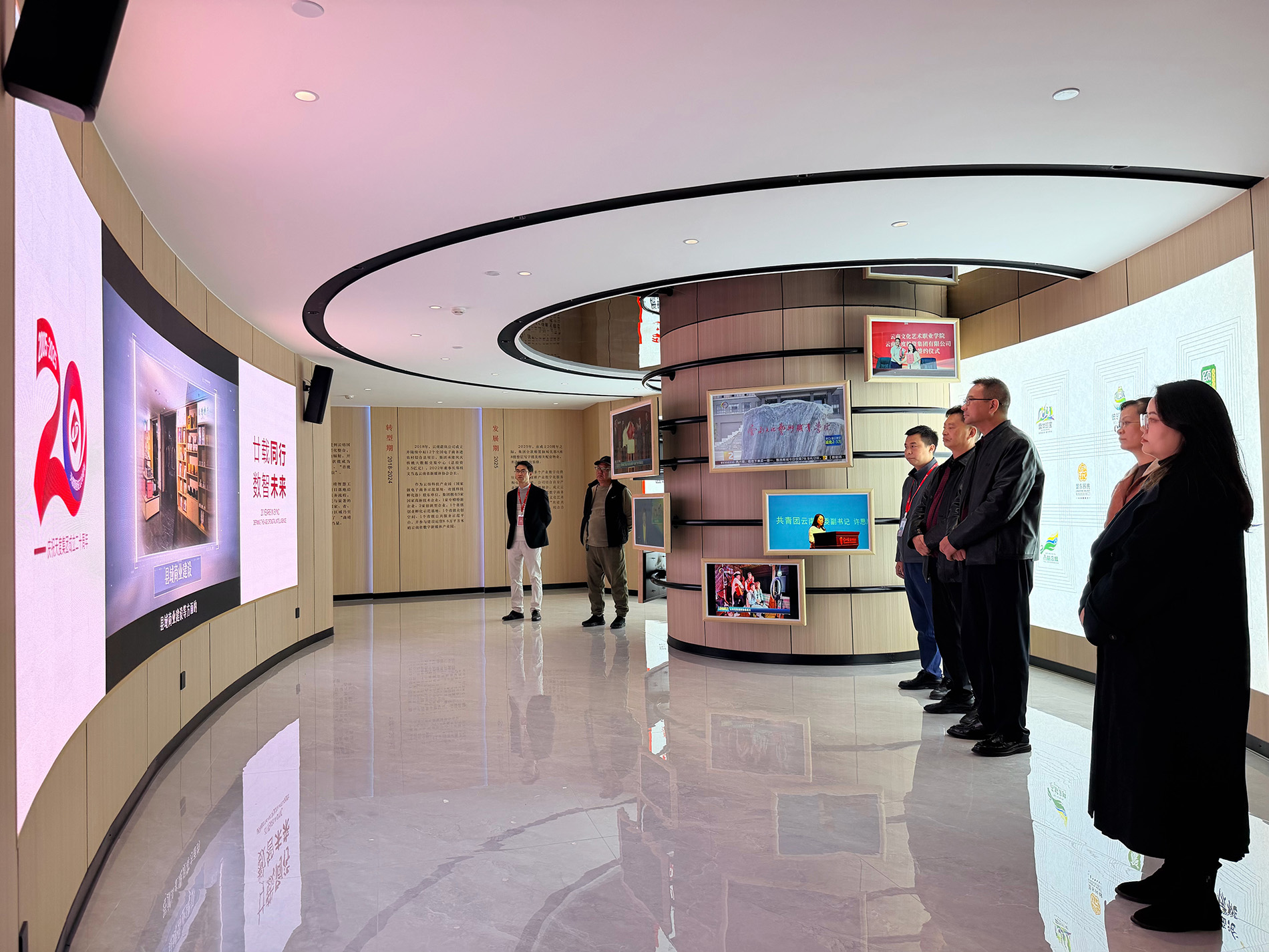 侬援校长一行在天度集团相关负责人的陪同下,参观了集团办公区与数字化展厅。通过实地走访,参访团深入了解了天度集团的企业文化、办公环境与团队风貌,并对集团在产业数字化、人工智能等领域的布局与实践有了直观了解。