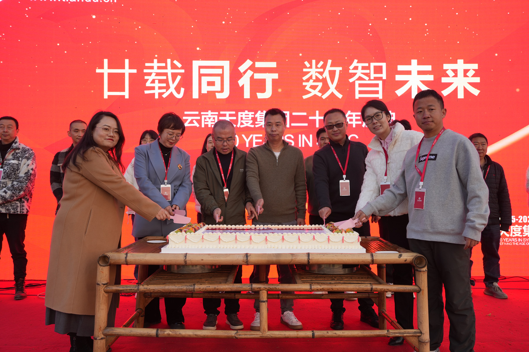 随后,郑桂文董事长率集团高管团队共同切开精心设计的二十周年巨型庆典蛋糕。甜蜜的喜悦,由所有天度人共同分享,将现场气氛推向首个高潮。