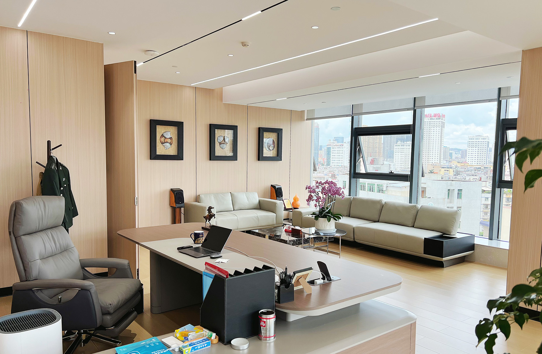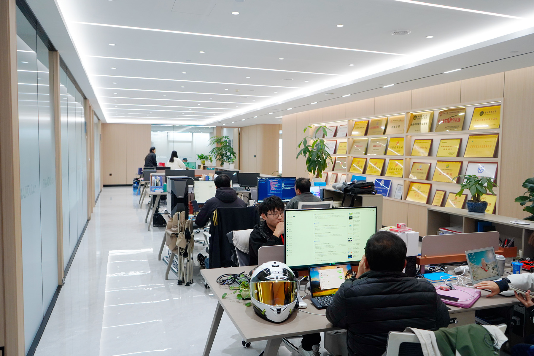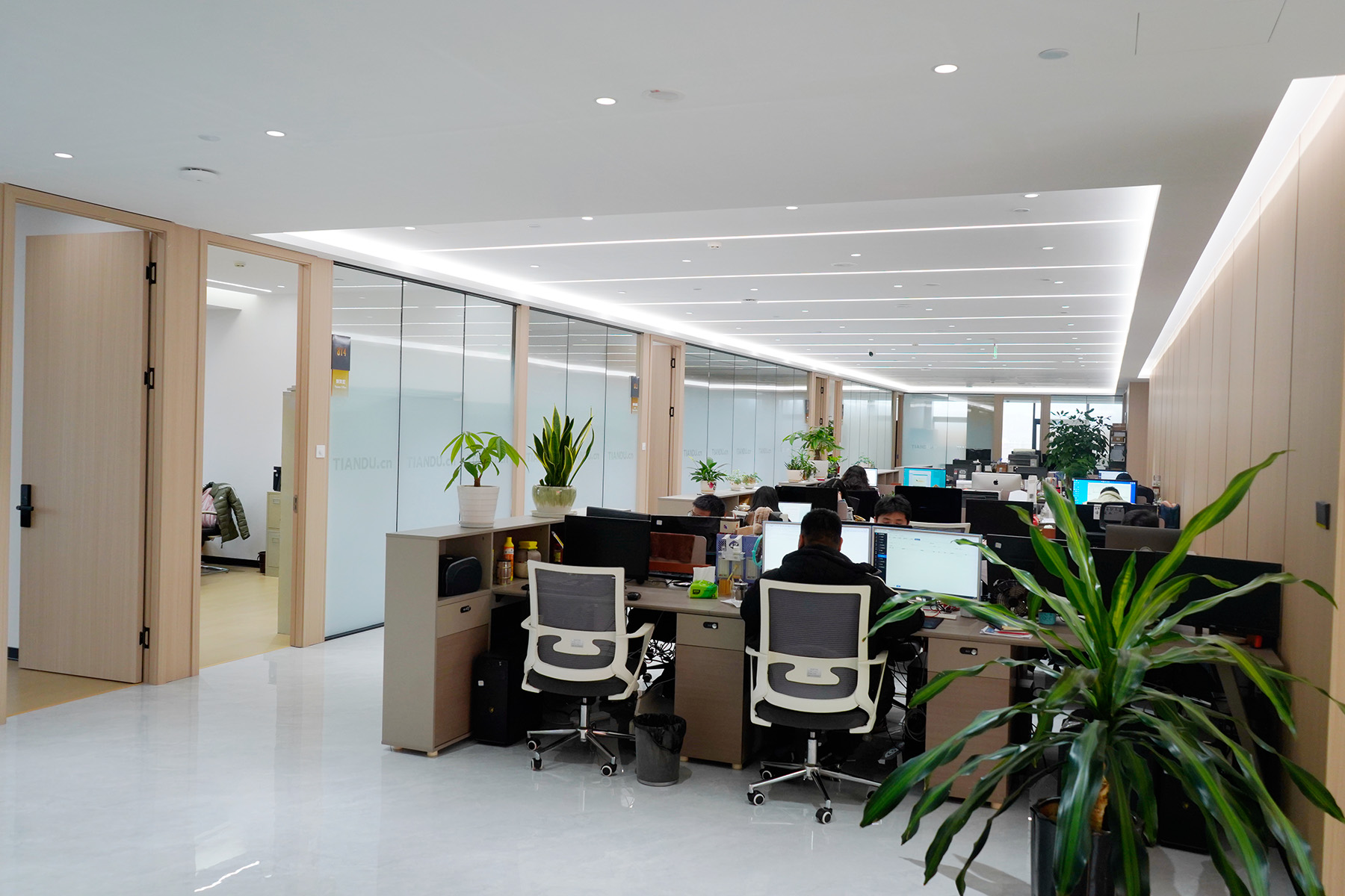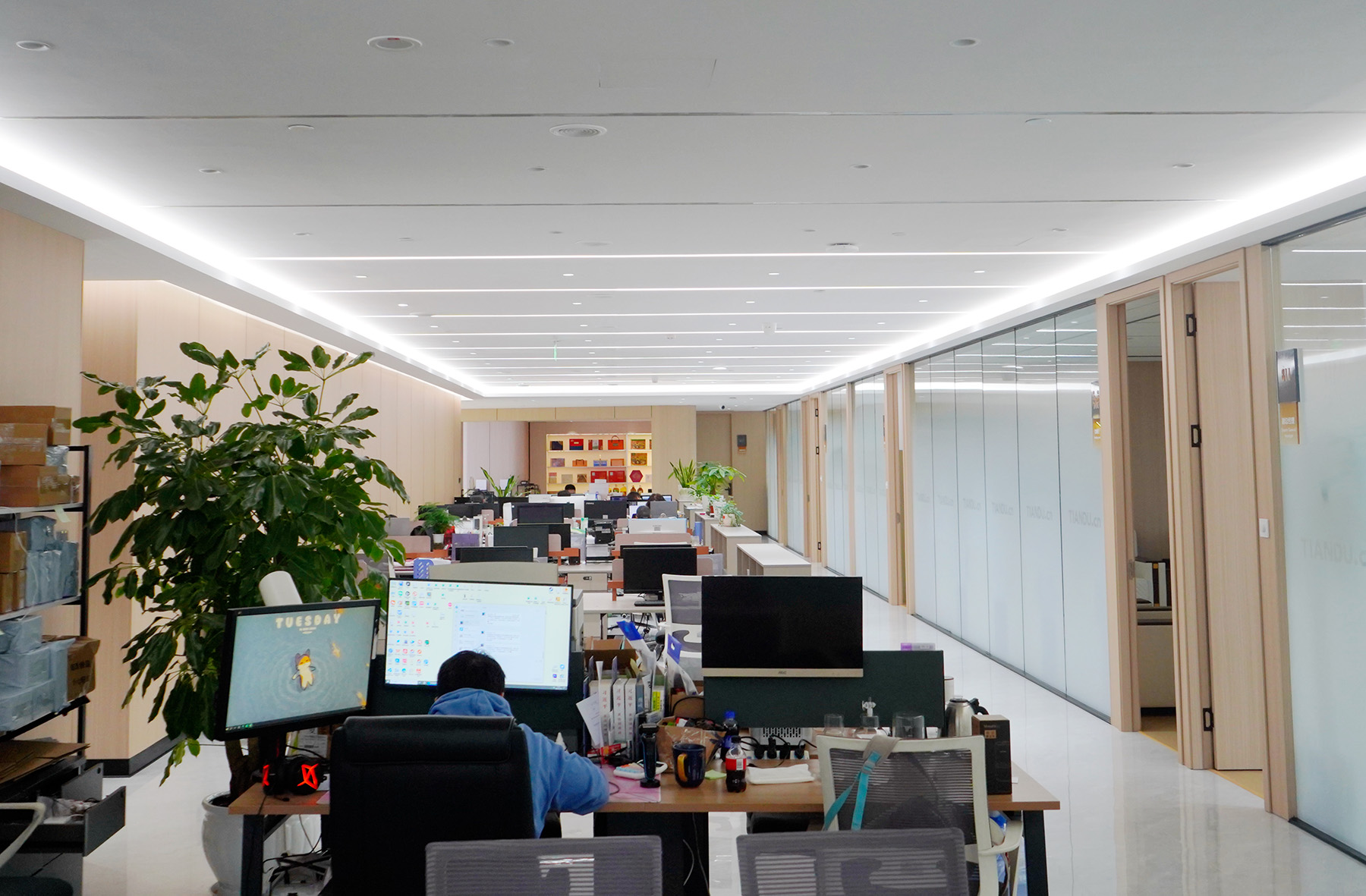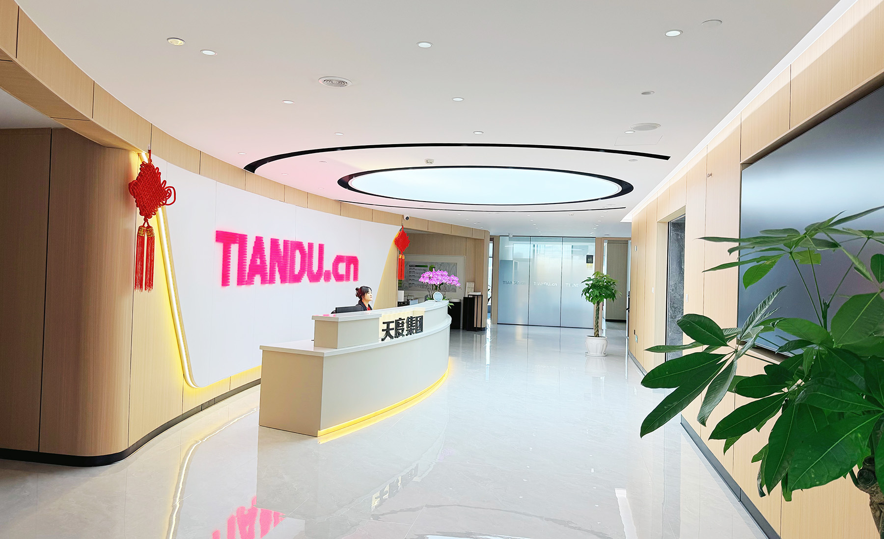 在天度成立二十周年之际,集团在融城优郡A座写字楼8楼购置了整层全新办公空间,并打造成为集数字技术研发中心、电商直播基地、产教融合创新平台等于一体的复合型空间,经过4个月的智能化装修施工,目前新办公室已经全面启用,云纺国际商厦旧址即日起停止使用。